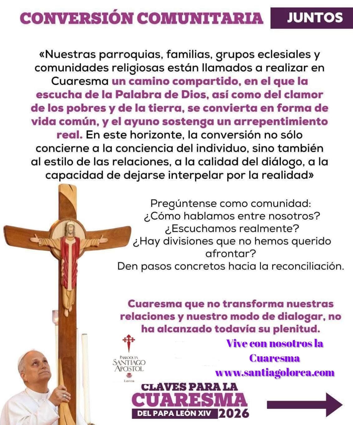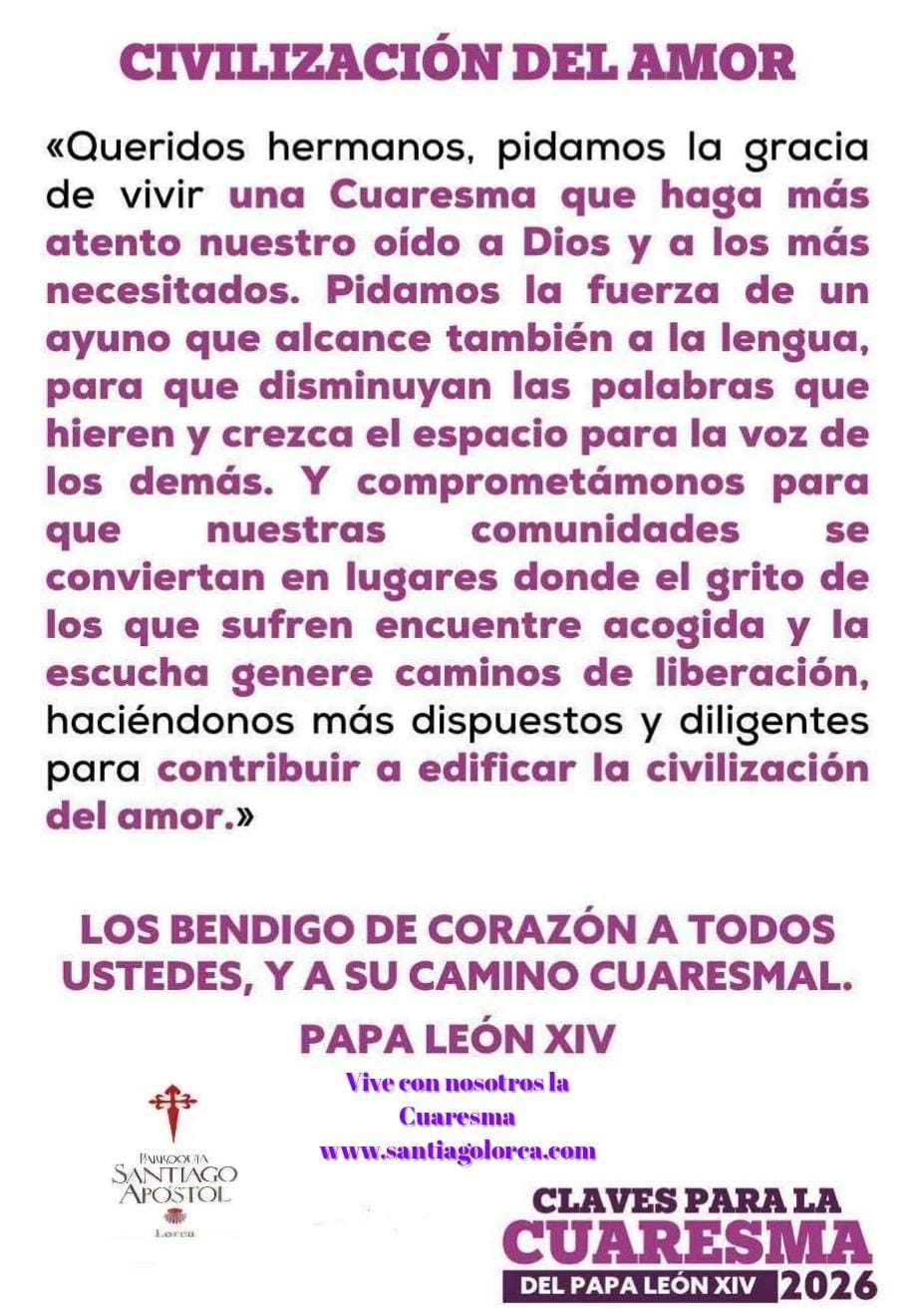 ![]() S.S. el papa León XIV ha heho público el mensaje para la Cuaresma 2026, que comienza el próximo 18 de febrero, Miércoles de Ceniza, bajo el título: "Escuchar y Ayunar" mas información |