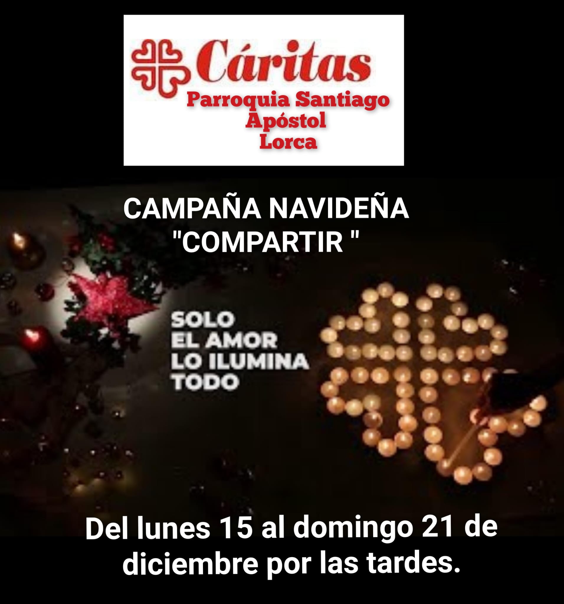 más lo necesitan. La Navidad es una época especial de dejar nacer lo nuevo, de abrir y tender manos para que brote la esperanza de todo lo bueno y que entre todos podemos hacer posible un mundo mejor. La Navidad es el faro que nos guía nuestro camino para seguir trabajando por los más necesitados, los empobrecidos, los solos, los últimos. Es la ternura del pasado, el valor del presente y la esperanza del futuro con las personas más vulnerables. En este Tiempo de Navidad tenemos que vivir el amor directamente en la realidad de *Cáritas* , para de este modo seguir situados en la clave del amor hacia las personas que más lo necesitan. En este Tiempo de Navidad somos conscientes de que la luz de Belén nos ilumina el camino y nos da energía para seguir trabajando en la construcción del Reino de Dios aquí en la Tierra. En este Tiempo de Navidad debemos seguir trabajando para construir una sociedad nueva y comprometida. Un año más nuestra parroquia de Santiago Apóstol colabora con la *campaña del COMPARTIR* desde las familias de los niños y niñas de catequesis de comunión, de confirmación, los feligreses,...en la recogida de *productos de higiene infantil*, como pueden ser pañales, toallitas, gel de baño, champú, colonia , crema para el cuerpo etcétera!!!! *Del lunes 15 al domingo 21 de diciembre por las tardes.* |