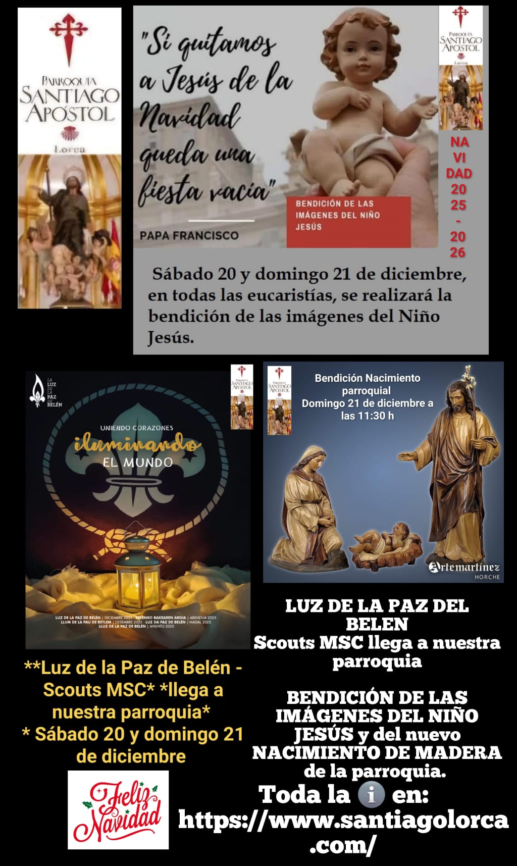 más lo necesitan. La Navidad es una época especial de dejar nacer lo nuevo, de abrir y tender manos para que brote la esperanza de todo lo bueno y que entre todos podemos hacer posible un mundo mejor. La Navidad es el faro que nos guía nuestro camino para seguir trabajando por los más necesitados, los empobrecidos, los solos, los últimos. Es la ternura del pasado, el valor del presente y la esperanza del futuro con las personas más vulnerables. En este Tiempo de Navidad tenemos que vivir el amor directamente en la realidad de *Cáritas* , para de este modo seguir situados en la clave del amor hacia las personas que más lo necesitan. En este Tiempo de Navidad somos conscientes de que la luz de Belén nos ilumina el camino y nos da energía para seguir trabajando en la construcción del Reino de Dios aquí en la Tierra. En este Tiempo de Navidad debemos seguir trabajando para construir una sociedad nueva y comprometida. Un año más nuestra parroquia de Santiago Apóstol colabora con la *campaña del COMPARTIR* desde las familias de los niños y niñas de catequesis de comunión, de confirmación, los feligreses,...en la recogida de *productos de higiene infantil*, como pueden ser pañales, toallitas, gel de baño, champú, colonia , crema para el cuerpo etcétera!!!! *Del lunes 15 al domingo 21 de diciembre por las tardes.* |