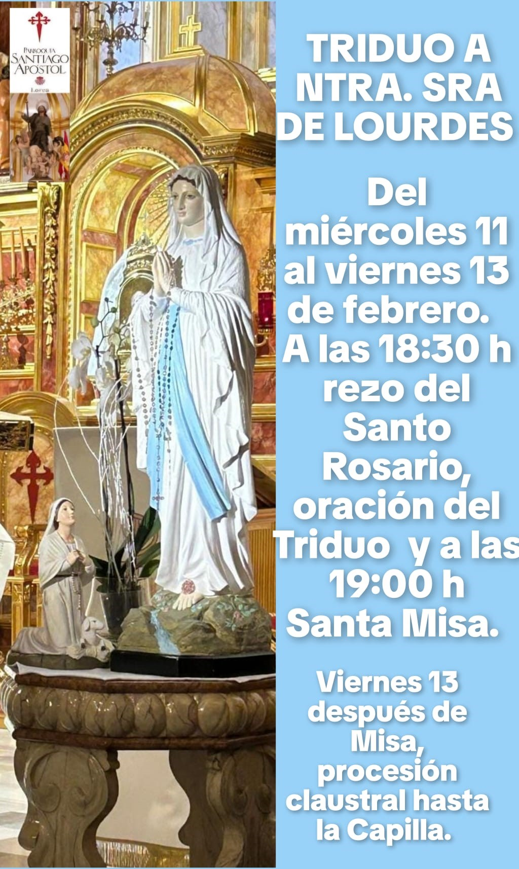 Rosario y oración del propia delTriduo. En el día de la VIRGEN DE LOURDES, le pedimos su
