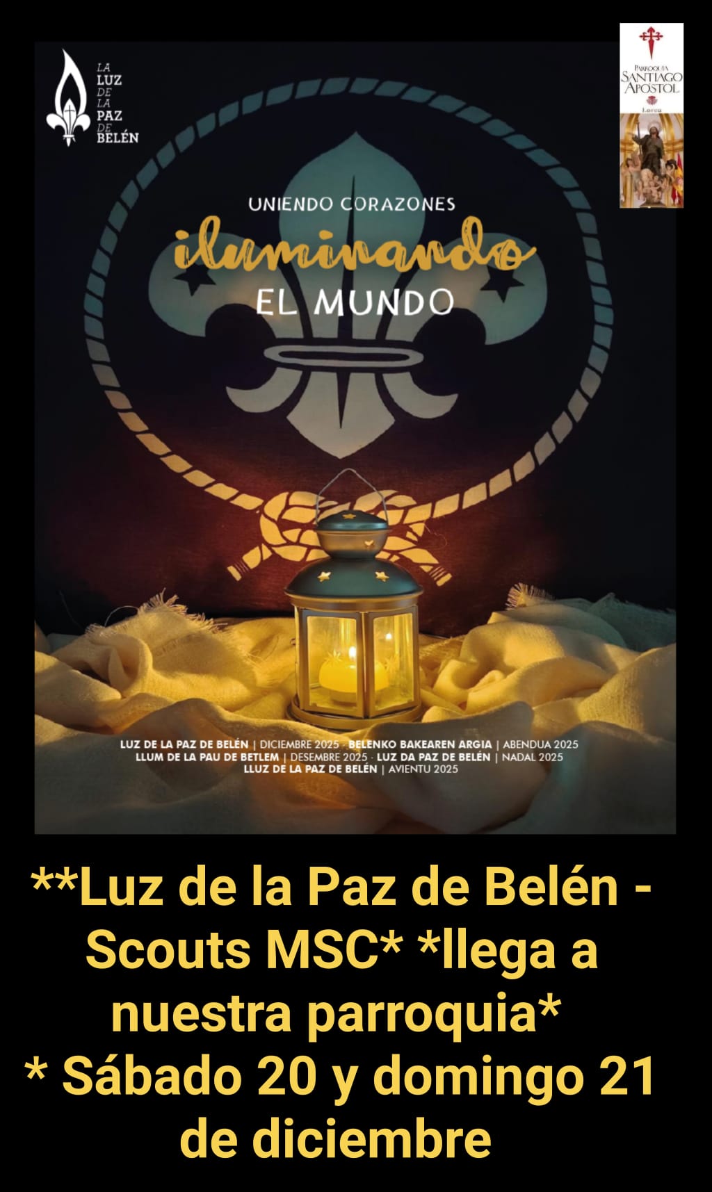niña austriaco en la *cueva del Nacimiento de Jesús*.La distribución de la Luz de la Paz a todos los países participantes se realiza desde Viena. Allí, unas semanas antes de Navidad, se reparte la Luz a todas las delegaciones asistentes para que la hagan llegar a sus respectivos países con un mensaje de Paz, Amor y Esperanza. Posteriormente, los Scouts y las Guías la distribuyen por parroquias, hogares particulares, hospitales, residencias de ancianos, prisiones y otras asociaciones de sus respectivos pueblos y ciudades. En España cada año, nos preparamos para acoger en nuestra casa la Luz de la Paz de Belén que nos acerca al sentido de la Navidad. En nuestra parroquia de Santiago Apóstol *el sábado 20 y domingo 21 de diciembre tendremos la Luz de la Paz de Belén* para distribuir a quien la desee tener. Deben de traer una vela y un recipiente para que no se apague y poder llevarla a casa. |